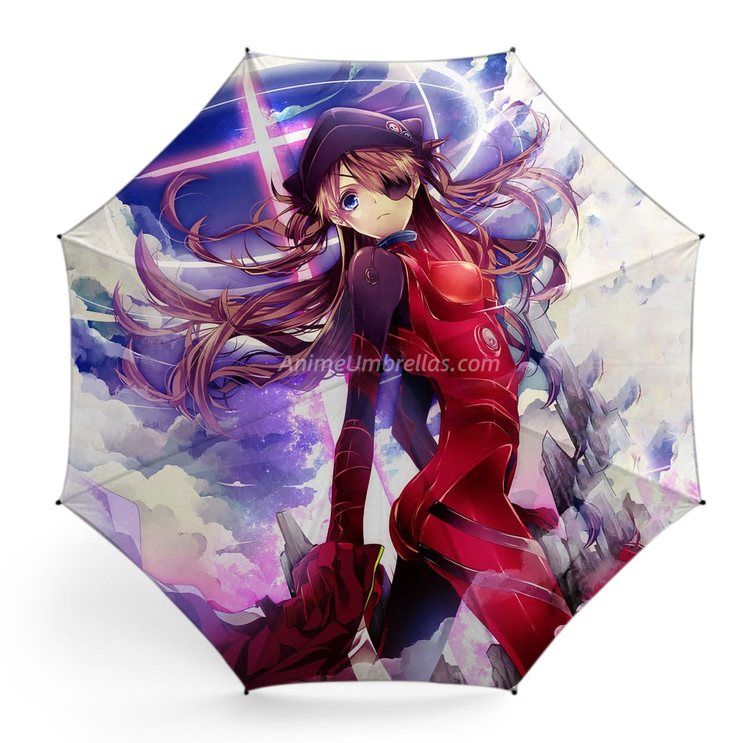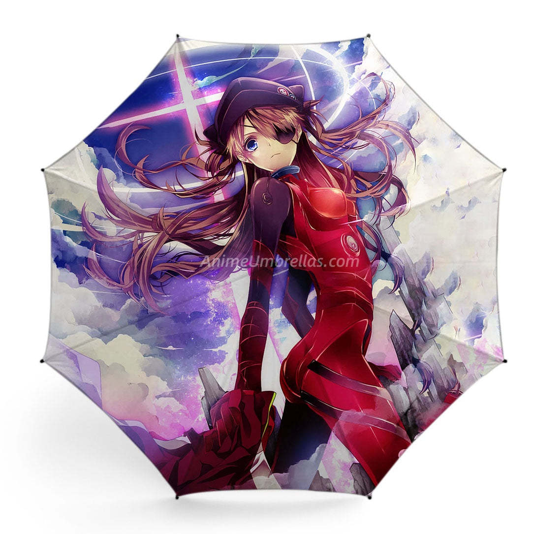 This umbrella captures Asuka in her red plugsuit with flowing hair and signature eyepatch. The purple-blue sky and futuristic buildings set the mood, showing her proud and determined spirit for Evangelion fans to carry even in the rain.