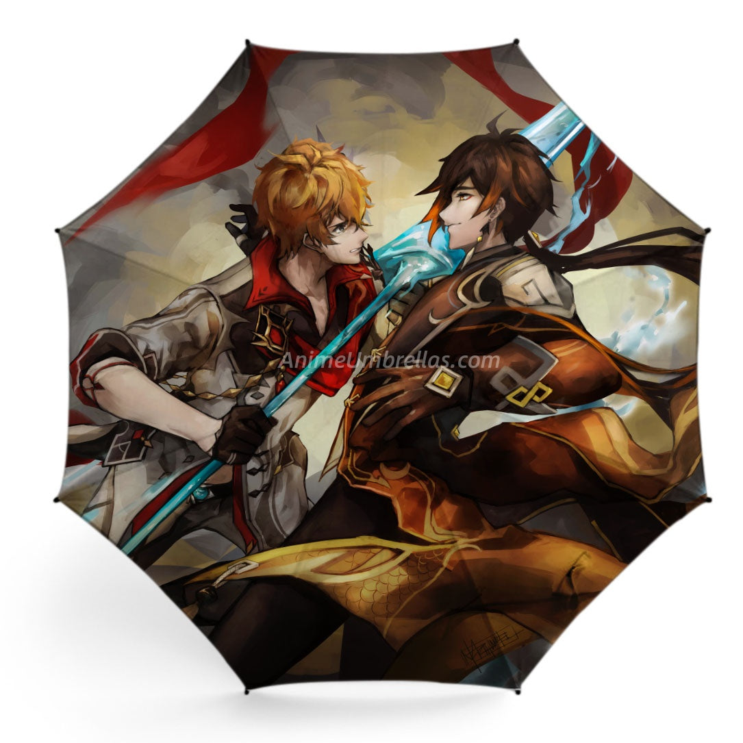 This Genshin Impact umbrella captures the epic showdown between Childe and Zhongli. Childe wields his spear, while Zhongli displays his Geo might - the tension fills the whole canopy. It’s functional yet collectible, bringing the excitement of Liyue’s story into your daily routine. Open it, and it feels like reliving their legendary clash all over again.
