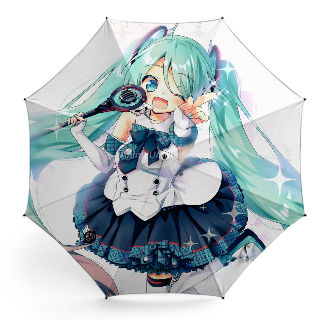 This Hatsune Miku umbrella shows her iconic look - mint-green twin tails, signature outfit, microphone in hand, and a bright, cheerful smile. The fresh, colorful design makes it more than just sun and rain protection. Open it, and it feels like bringing Miku’s youthful energy and music vibe into everyday life - always ready for your own little 2D concert moment.