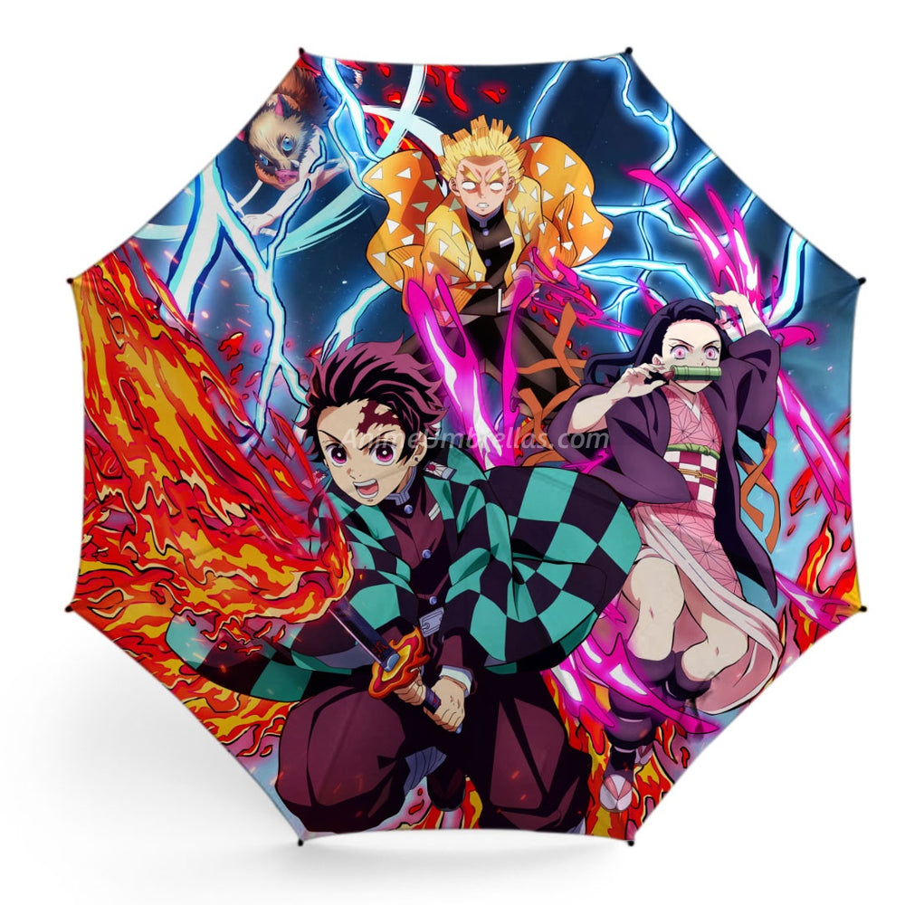 This Demon Slayer umbrella showcases Tanjiro, Nezuko, Zenitsu, and Inosuke in a colorful, action-packed scene. The vivid skill effects and explosive colors bring the intensity of battle right onto the canopy. More than just protection from rain and sun, it lets fans carry the fiery moments of the anime into daily life - turning every rainy day into a battle-charged experience.