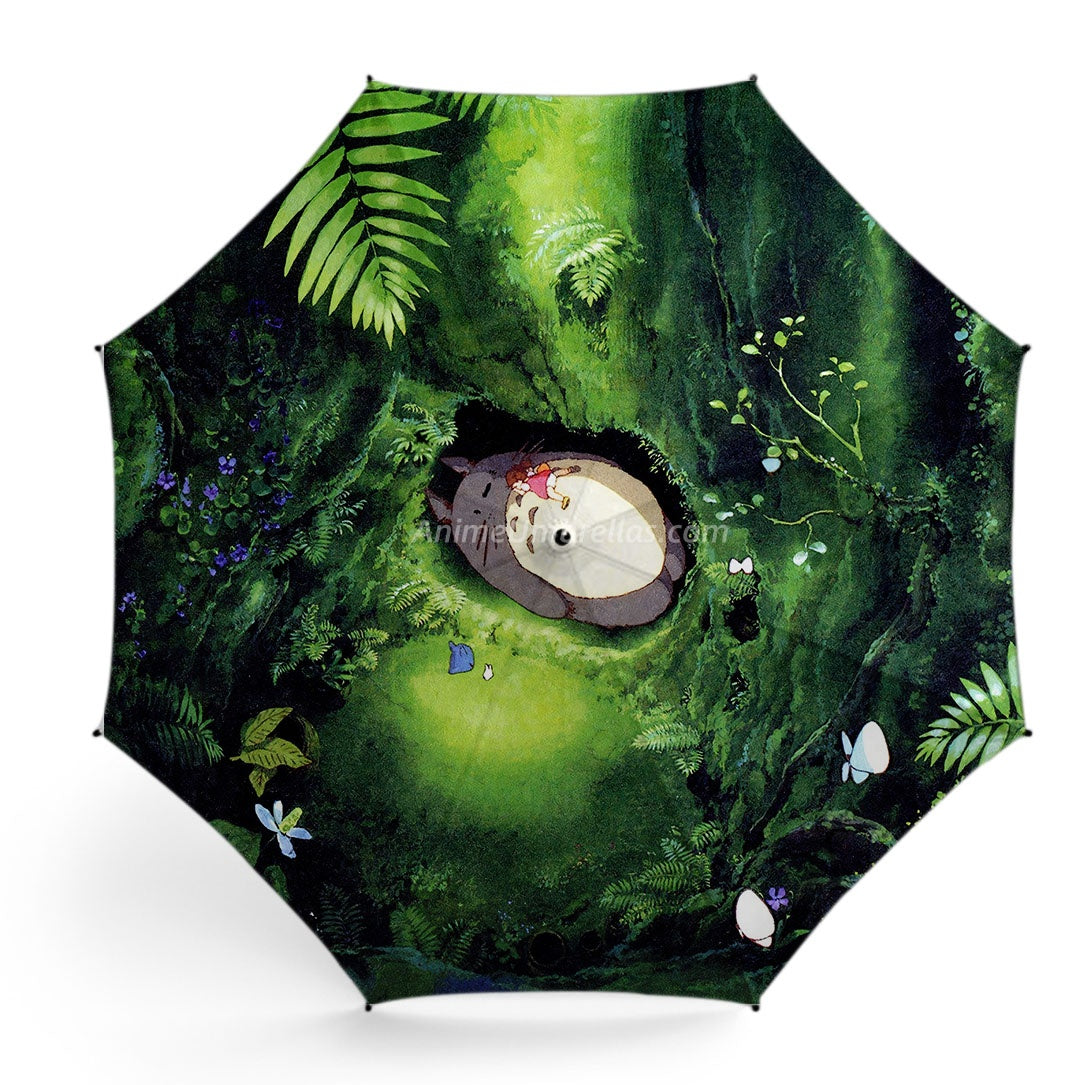 This umbrella captures a heartwarming moment of Totoro and a little girl in a hidden forest. Surrounded by lush greenery and bathed in a soft green glow, the girl rests peacefully on Totoro's round body. Flowers and butterflies add a touch of magic, filling the scene with Ghibli's gentle wonder and healing charm.