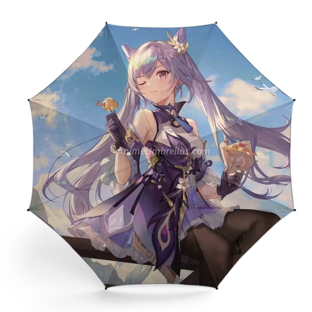 This Genshin Impact umbrella brings Keqing's elegance and ease to life. Her flowing purple hair and playful cat ears stand out, along with her signature Liyue-style outfit in purple and white tones. She's pictured holding snacks and small trinkets, with a relaxed and cheerful expression. The background features blue skies, drifting clouds, and soaring birds over distant mountains, evoking the peaceful charm of everyday life in Liyue.