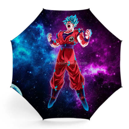 This umbrella shows Goku in his Super Saiyan Blue form with bright blue hair and a red gi. Standing powerfully in the center, he is framed by a cosmic starfield of planets and nebulae, radiating both strength and awe.