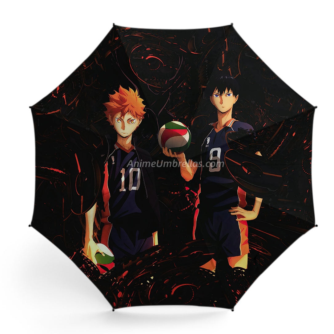 This umbrella showcases Hinata and Kageyama standing side by side in their Karasuno uniforms, volleyballs in hand. The red-and-black mechanical background radiates intensity, symbolizing their teamwork and unshakable bond on the court. Open it, and you'll feel their unyielding spirit and synchronicity.