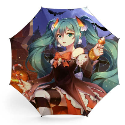 This Hatsune Miku umbrella features Miku in a festive Halloween design - twin tails with animal ear accessories, a cute dress, and pumpkin candy in hand, with bats and spooky details filling the scene. Beyond shielding from rain or sun, it’s a collectible for fans who love both anime and holiday spirit. Open it, and it’s like carrying Miku’s adorable, magical vibe into your everyday outings.