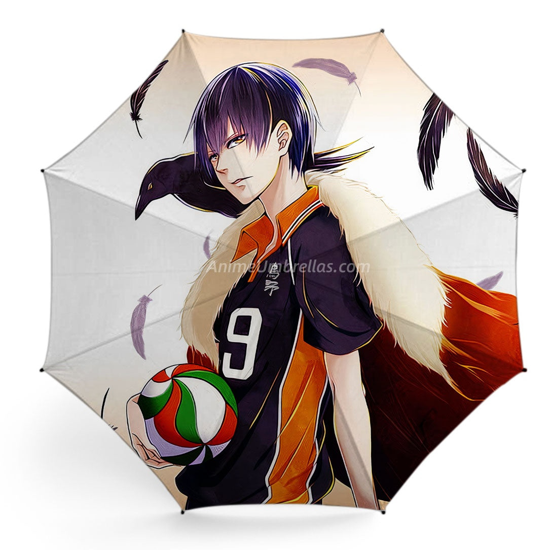This umbrella features Tobio Kageyama from Haikyu!!, the genius setter of Karasuno High with unmatched game sense and a commanding King presence. The canopy captures his striking pose - draped in a distinctive cape, volleyball in hand, while crow and feather motifs echo his fierce, hawk-like energy on the court. A must-have for volleyball fans, this umbrella turns every rainy day into a reminder of passion and the spirit of competition.