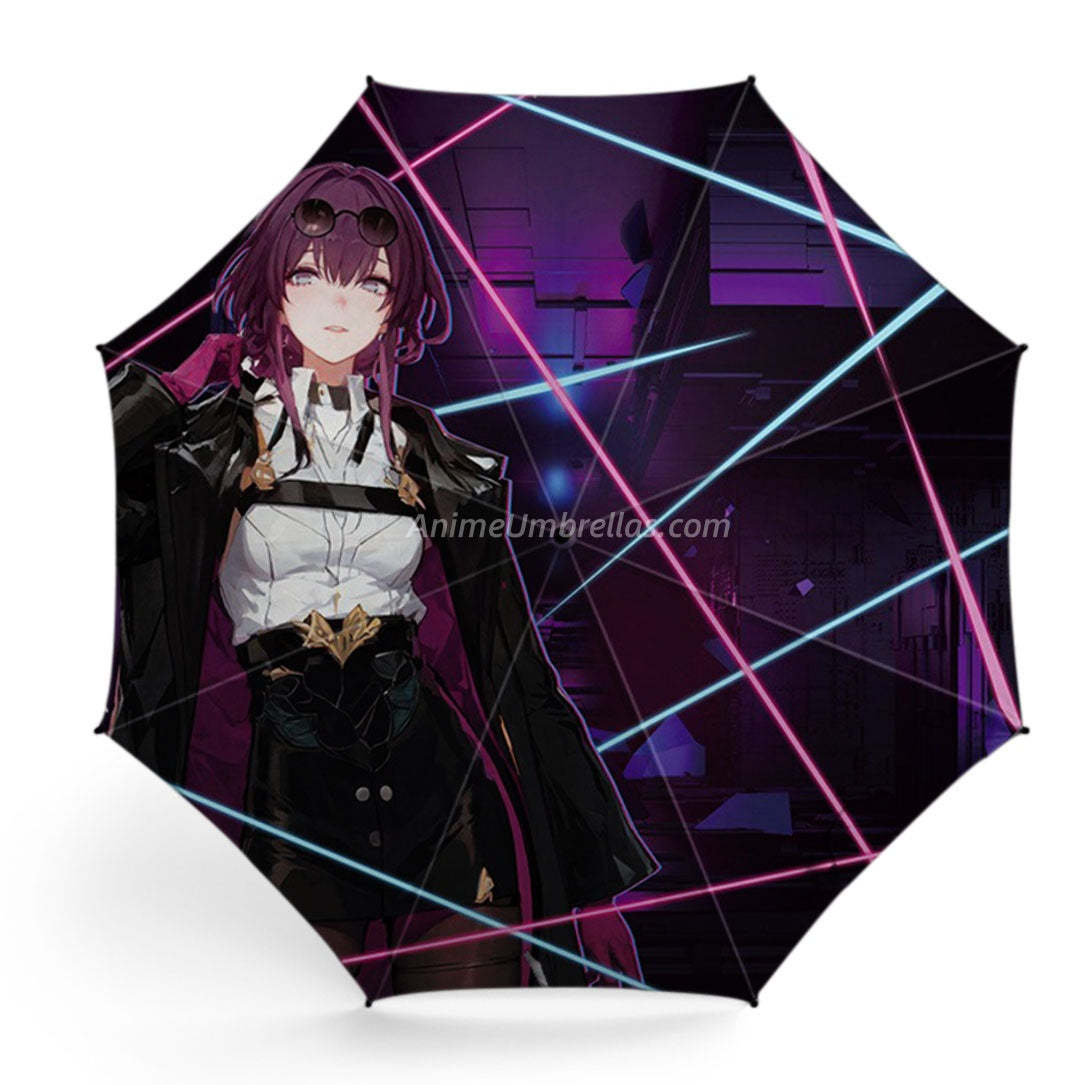 Bold and stylish, this umbrella showcases Kafka in a dynamic pose inside a cyberpunk world. Her purple hair, dark shades, and sleek outfit are paired with neon lines slicing through the tech-themed background. It captures the danger and allure of the Stellaron Hunter in one stunning design. Step out with Kafka's cool aura by your side - this umbrella is a must-have fashion statement for Star Rail fans.