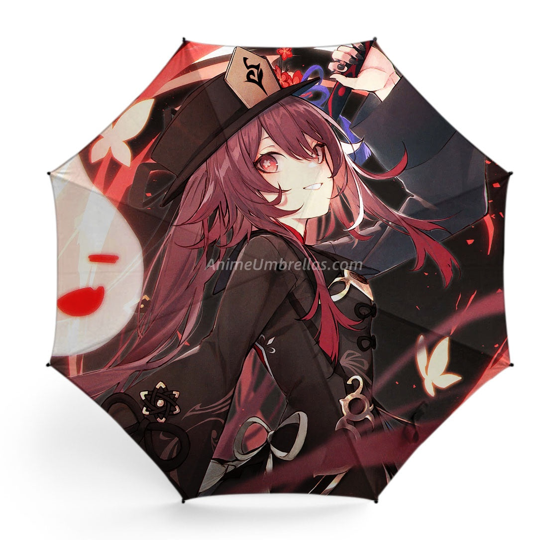 This umbrella presents Hu Tao with her iconic hat, long hair, and expressive gaze. Surrounded by flame effects and mysterious patterns against a red and black background, the artwork shows both her playful spirit and enigmatic aura. It lets Genshin Impact fans bring Hu Tao's vibrant charm and the magic of Teyvat into rainy days.