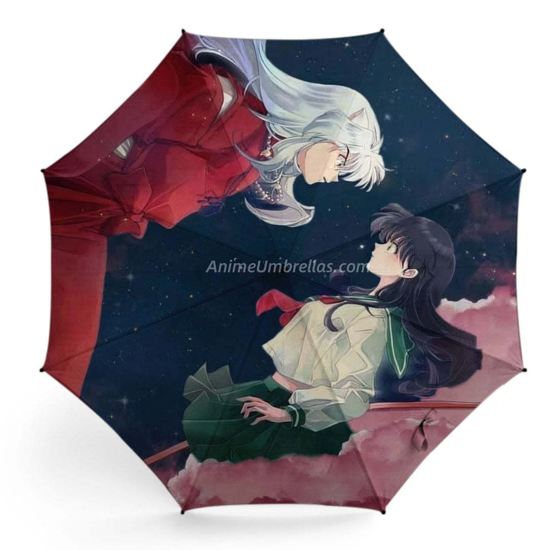 This Inuyasha umbrella showcases a romantic moment, Inuyasha in his red robe and silver hair gazing at Kagome in her school uniform under starry clouds. Sweet and dreamy, it captures their timeless connection. Beyond shielding from rain or sun, it carries their love that bridges time itself. Open it, and it’s like reliving the romance between past and present.