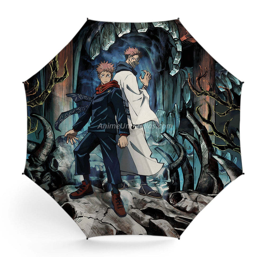 The canopy presents Yuji and Sukuna together in a surreal scene filled with eerie plants and bones. The fantasy setting reflects the cursed world of the anime, letting fans carry both tension and wonder on rainy days.