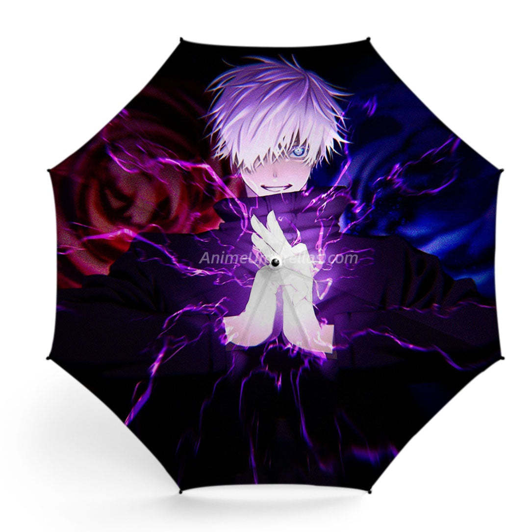 This Gojo Satoru-themed umbrella from Jujutsu Kaisen captures the epic moment of his purple technique in full power. His white hair flares out, and one piercing blue eye peeks from beneath his brow, brimming with intensity. Lightning-like cursed energy explodes from his joined hands, set against a dark, dramatic backdrop that highlights his overwhelming presence. Open this umbrella, and it's like bringing Gojo's unstoppable aura with you - bold, stylish, and made for fans who want the strongest sorcerer by their side, even on rainy days.