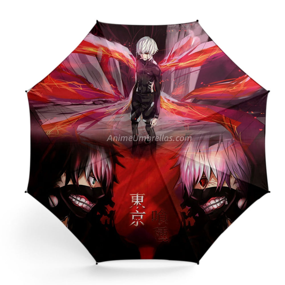 This Tokyo Ghoul umbrella puts Ken Kaneki front and center in a striking design. His stark white hair and dark outfit create a sharp contrast, while his kagune flares out behind him like blazing fire. Below, a second image shows Kaneki wearing his iconic ghoul mask - his twisted grin and piercing gaze radiate raw, ghoul-like power.