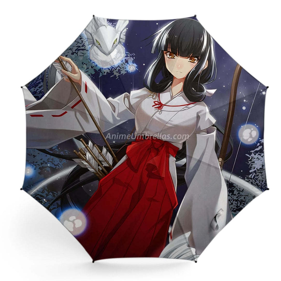 This Inuyasha umbrella highlights Kikyo's timeless image beneath the moonlight. Dressed in her shrine maiden attire, white robe and red hakama. She holds her bow, surrounded by a soft glow of spiritual energy, with guardian spirits at her side. Against a snowy forest and deep-blue night sky, her presence radiates both elegance and strength. Open it, and you'll feel as if you've entered a mystical night of the Sengoku era, carrying Kikyo's quiet power and gentle resolve wherever you go.