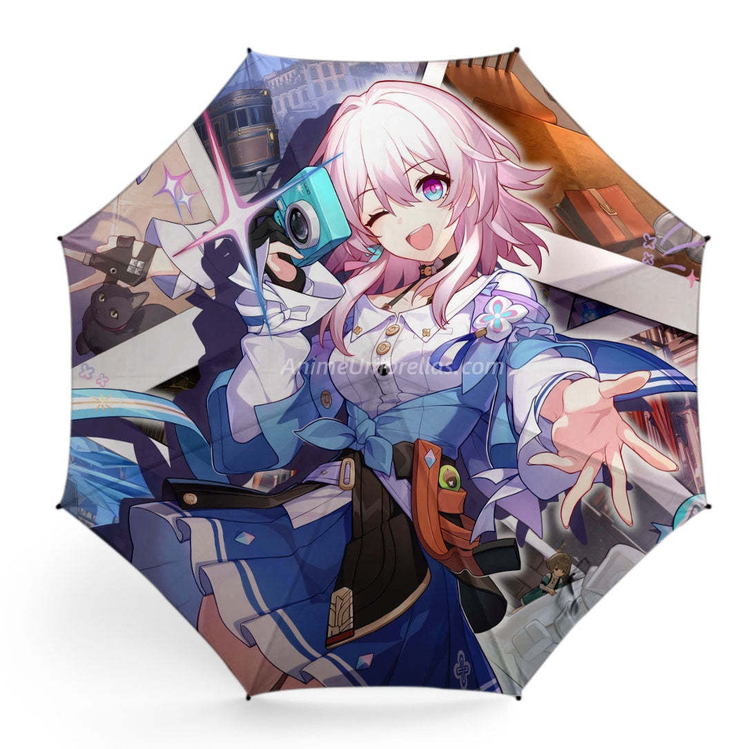 This umbrella features March 7th holding a camera with a bright smile. Dressed in blue and white with cute details around her, the design is full of energy and youthful charm, letting fans carry her lively spirit and the adventure of Honkai Star Rail on rainy days.