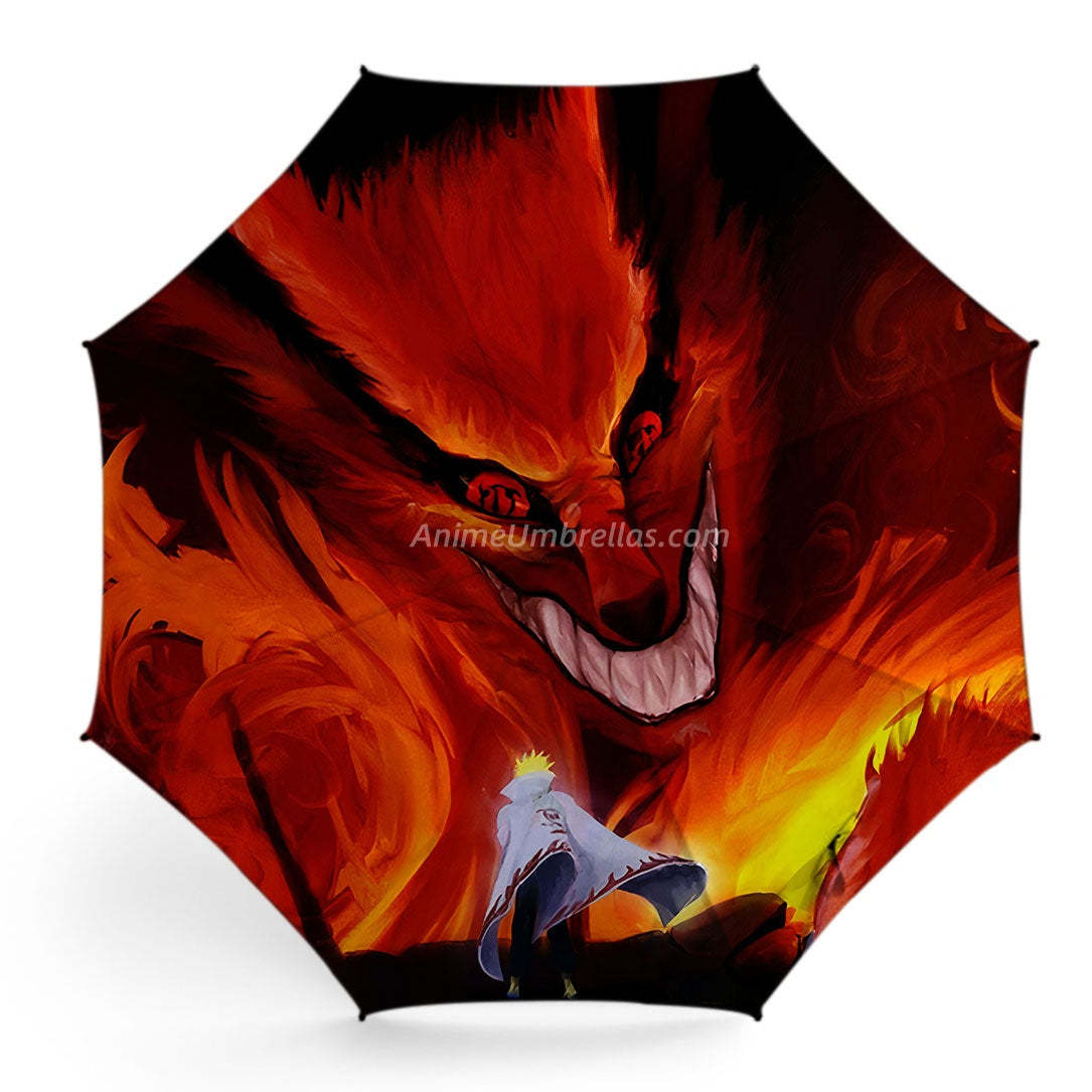 This Naruto umbrella brings to life the breathtaking clash between Minato Namikaze and the Nine-Tails. Kurama looms massive, flames swirling with terrifying force, its fierce face radiating pure menace. Facing him, Minato stands tall in his Fourth Hokage cloak, fearless and commanding, as if ready to hold back the beast with sheer willpower.