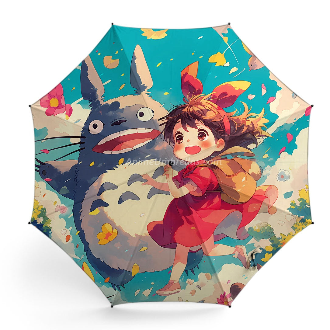 This umbrella showcases a heartwarming scene of Totoro with Mei. Against a blue sky background with falling petals and fluffy clouds, Totoro looks adorable while Mei, in her red dress and school bag, beams with joy. The overall design radiates innocence and comfort, letting Totoro fans carry the warmth and magic of Studio Ghibli even on rainy days.