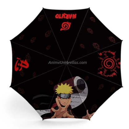 This Naruto umbrella features a striking design with a black base and bold red accents, including the Hidden Leaf symbol and curse mark motifs. At the bottom of the canopy stands Naruto, headband tied, hands forming a jutsu sign, eyes filled with determination. He looks ready to unleash his next move, capturing his strength, energy, and unwavering resolve in a bold visual tribute.
