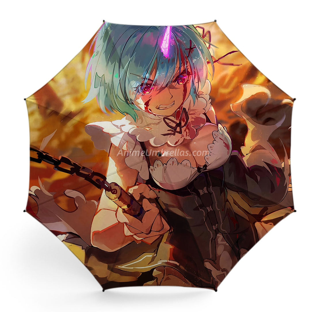 This umbrella captures Rem in a striking battle pose, dressed in her maid outfit with chain weapon in hand. The warm-toned background highlights her strength and determination.