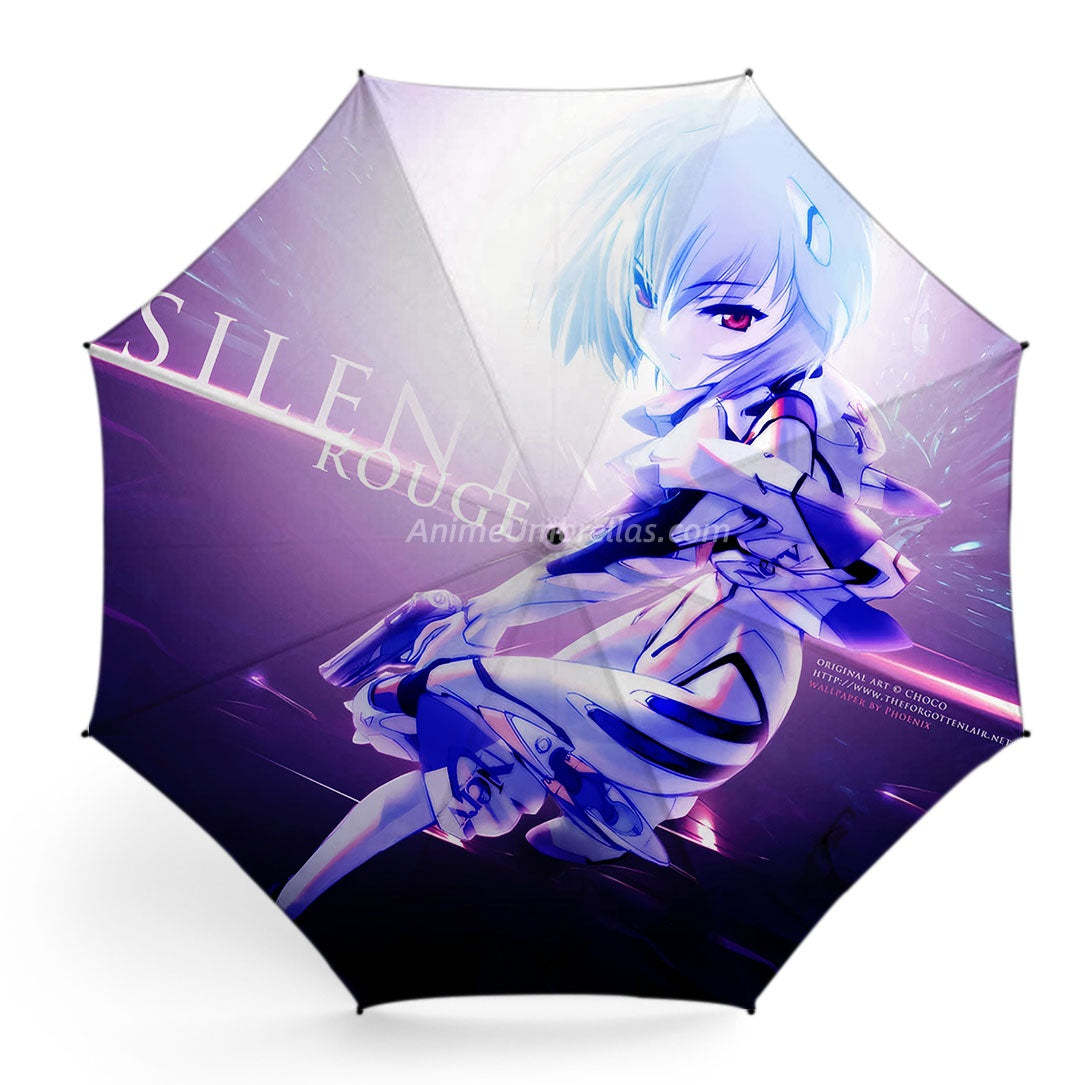 This umbrella features Rei Ayanami in her plugsuit, striking a cool pose. Her short blue hair and sharp red eyes stand out against a high-tech purple-blue background with the words SILENT ROUGE. Open it and feel the mysterious and intense atmosphere of Evangelion, bringing Rei's unique charm with you on rainy days.