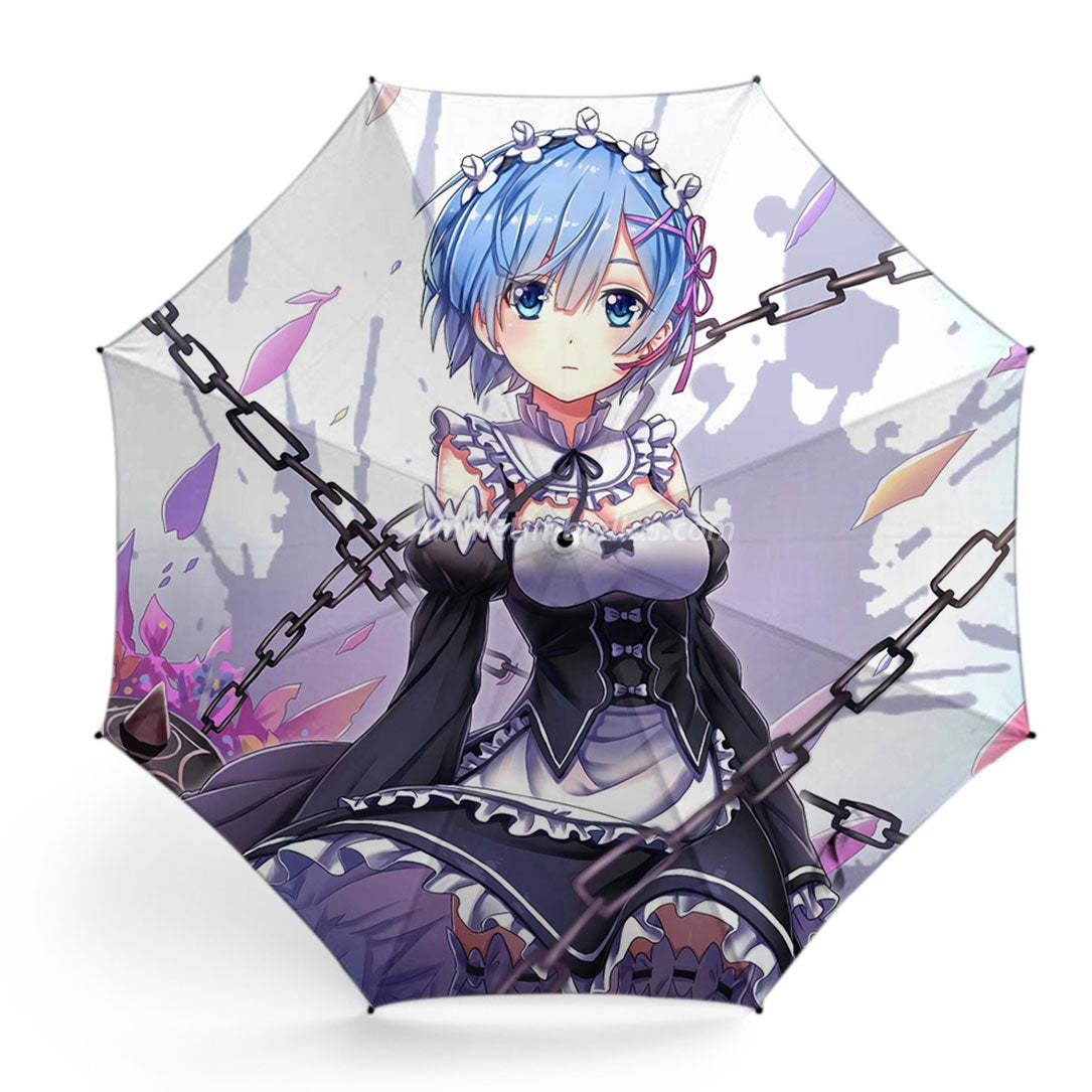 This Rem-themed Re:Zero umbrella blends sweetness with sorrow in a stunning design. Dressed in her iconic maid outfit, Rem is shown with her signature blue hair and delicate accessories. Her eyes reflect both strength and restraint, while chains curl around her, breaking the soft aesthetic and adding emotional depth. A shattered background and drifting petals complete the scene, capturing the danger and beauty of the fantasy world she lives in.