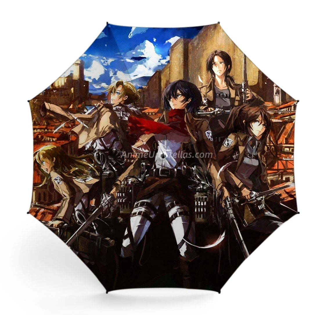This Attack on Titan umbrella gathers the heroic figures of the Survey Corps. Clad in their uniforms and equipped with ODM gear, blades ready, they stand before the towering walls and storied towns. Birds soar across the sky above, a symbol of freedom. Open the umbrella and feel the unbreakable courage and determination of the Corps' charge for liberty.