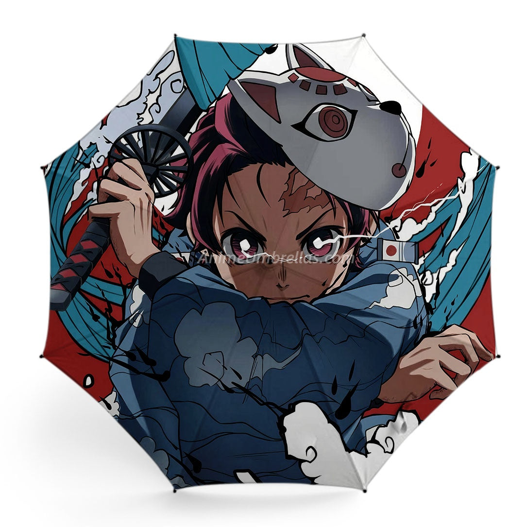 The canopy shows Tanjiro in his fox mask, wielding his Nichirin blade, surrounded by vivid blue and red effects. The scene emphasizes his determination and fighting spirit, allowing Demon Slayer fans to bring Tanjiro's strength and the anime's fantasy into the rain.