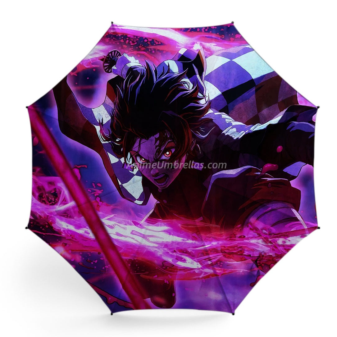 This umbrella depicts Tanjiro in an intense battle moment. His hair whirls, eyes sharp, surrounded by powerful pink and purple water-breathing effects. The dynamic scene is full of motion and strength, letting Demon Slayer fans carry Tanjiro's fighting spirit and the anime's fantasy energy in the rain.