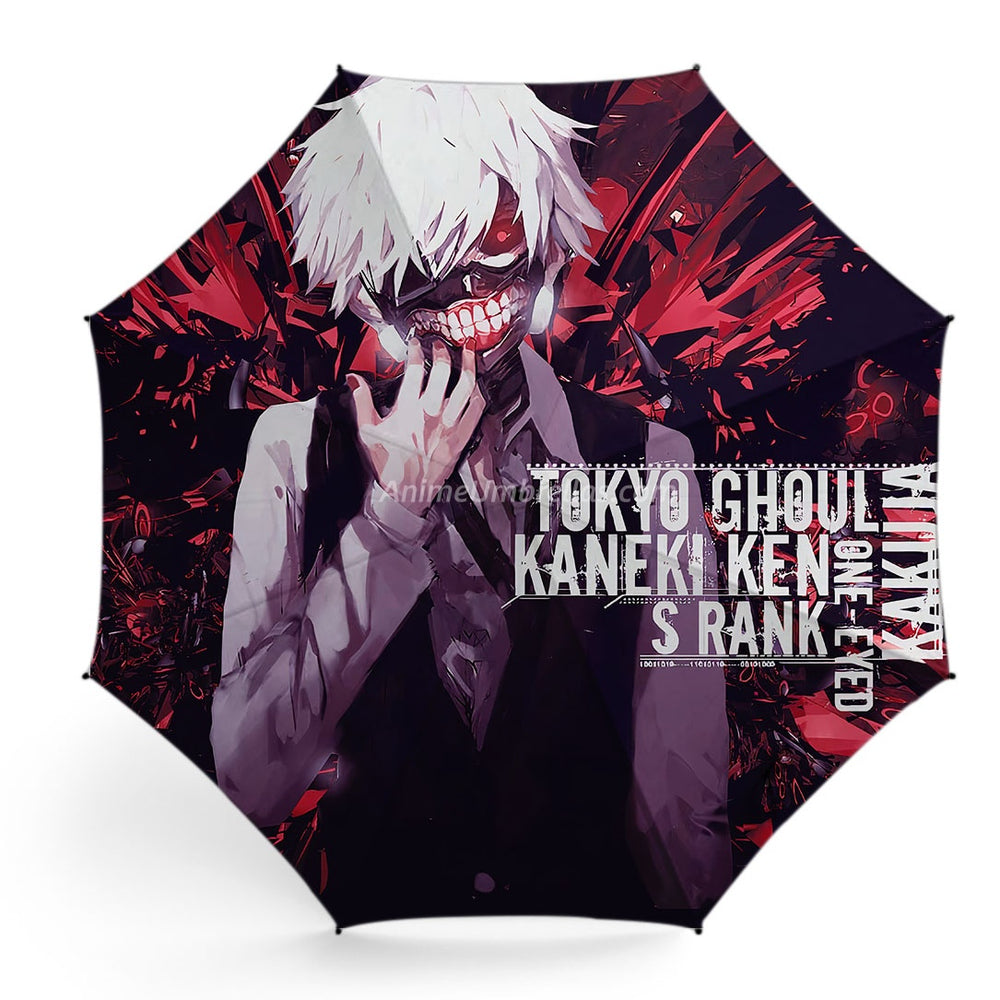 This canopy presents Kaneki with white short hair, sharp teeth, and his mask, standing against a fractured redandblack design with TOKYO GHOUL KANEKI KEN S RANK text. Dark, intense, and unmistakably iconic.