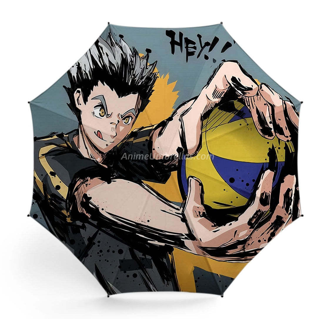 This umbrella freezes Bokuto Koutarou's explosive moment before striking the ball. His sharp focus, firm grip on the volleyball, and splattered ink effects with HEY! HEY! capture his raw energy and excitement. Open it and almost feel the force of the ball smashing across the court.