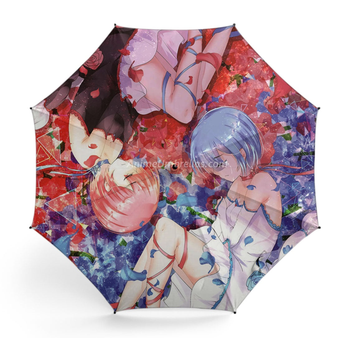 This Re:Zero umbrella once again highlights the graceful charm of Ram and Rem. The design shows the sisters in elegant gowns, reclining lazily among a lush bed of colorful blossoms. Petals drift through the air, creating a romantic and ethereal vibe that feels like a scene pulled straight from a dream or another world.